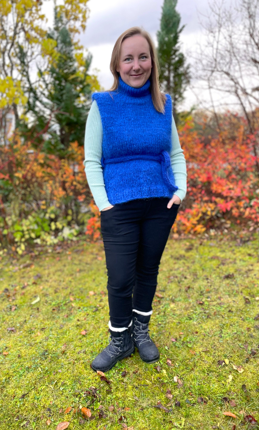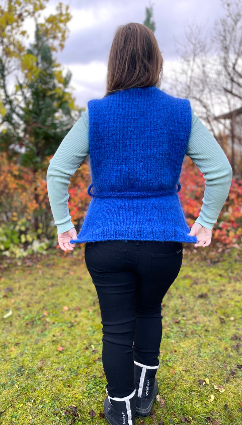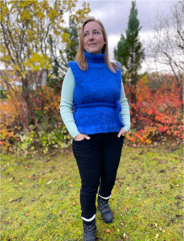 Vesten strikkes i tredobbel tråd. En tråd av hver av følgende kvaliteter: